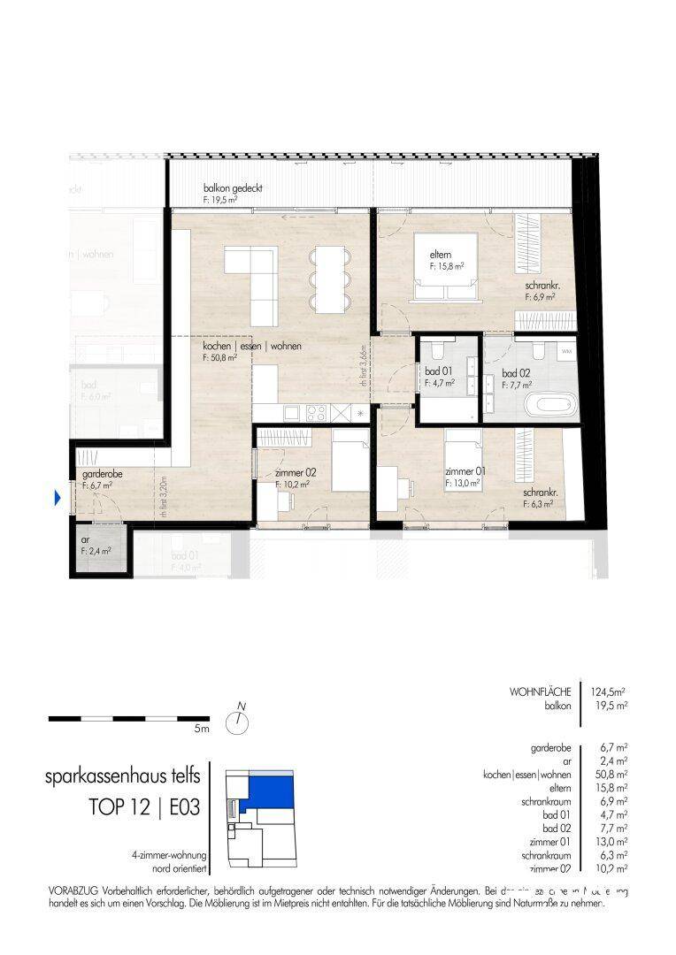 Exklusive Neubau-Balkonwohnung im Zentrum von Telfs zu vermieten. Top12