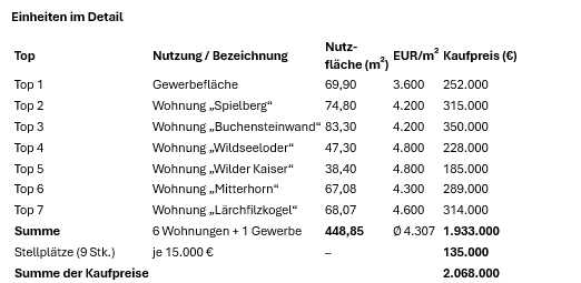 Anlageobjekt im Zentrum von Fieberbrunn – 6 Wohnungen, 1 Geschäftsfläche & 9 Stellplätze in einem parifizierten Objekt