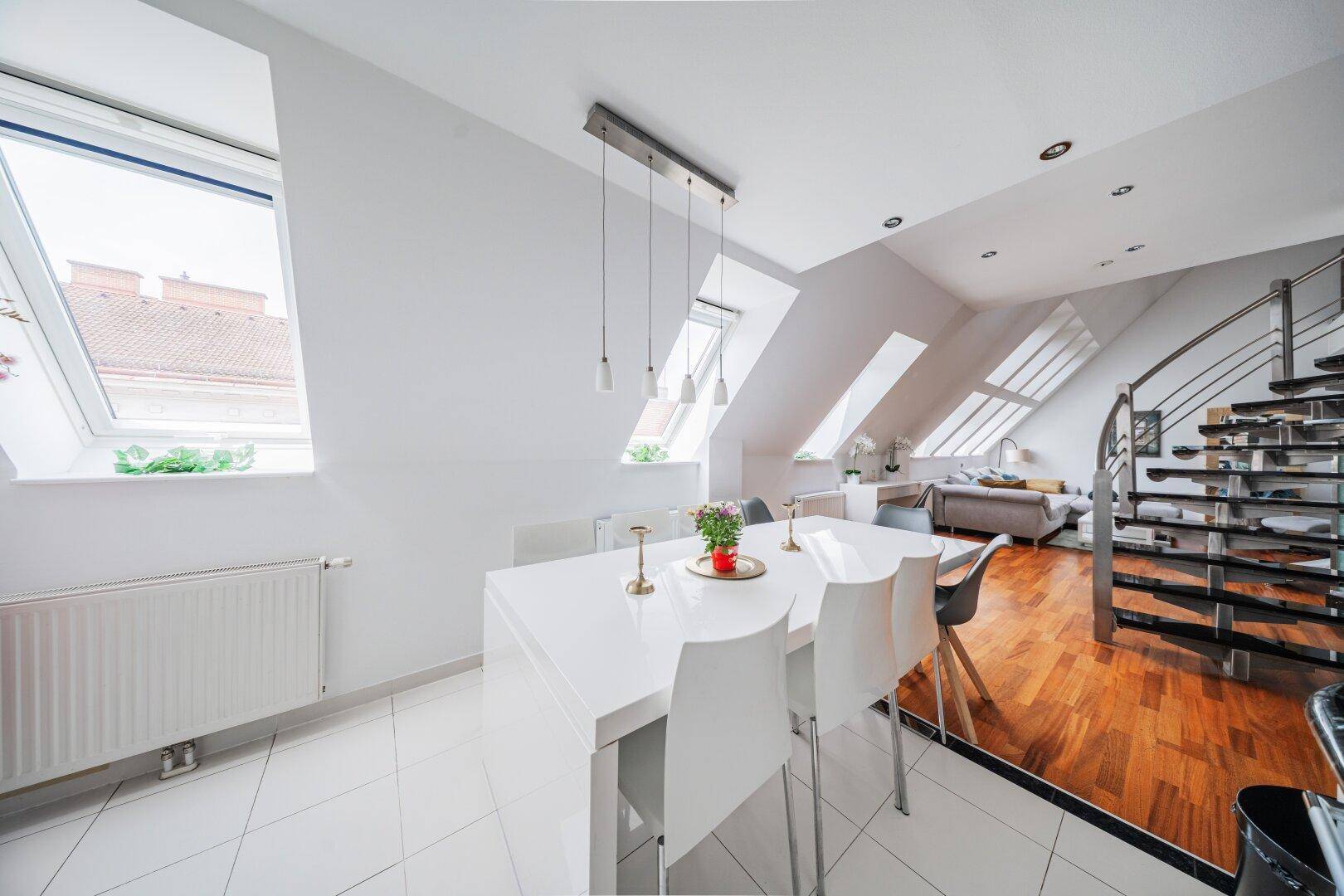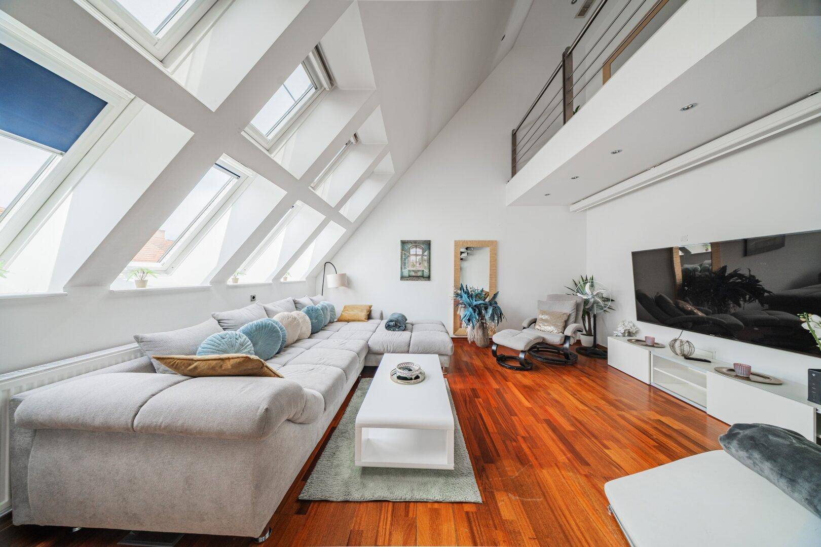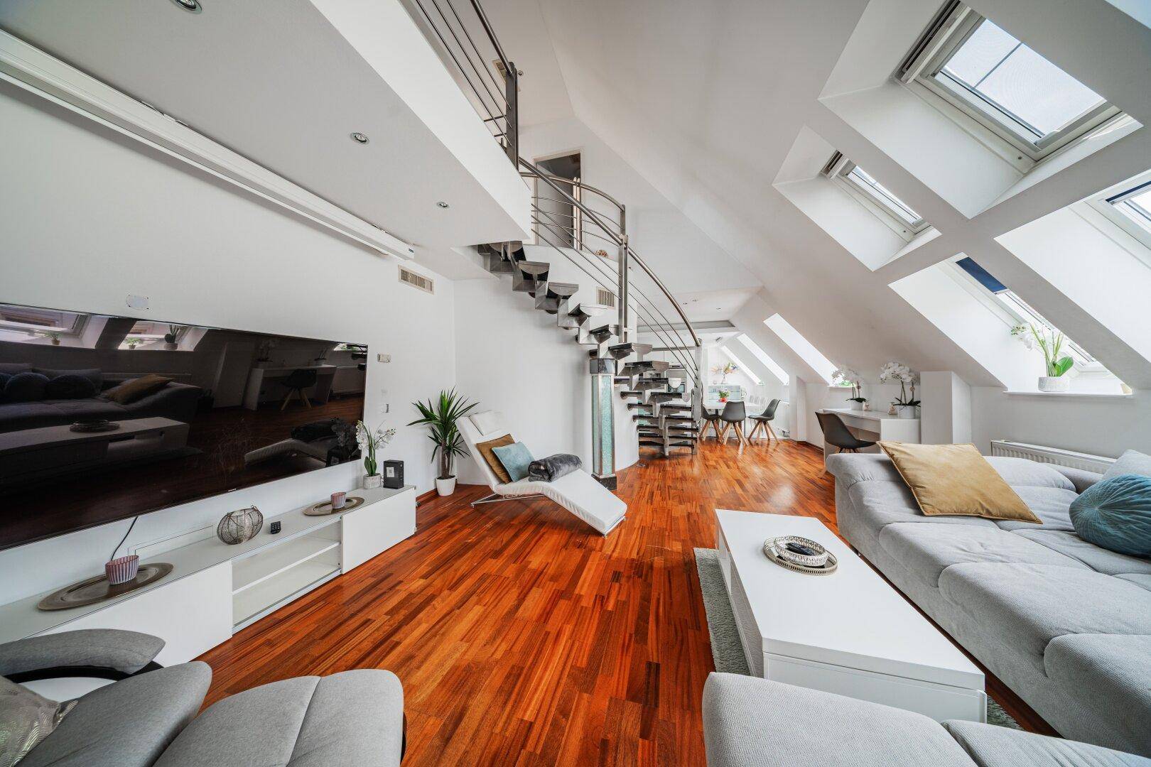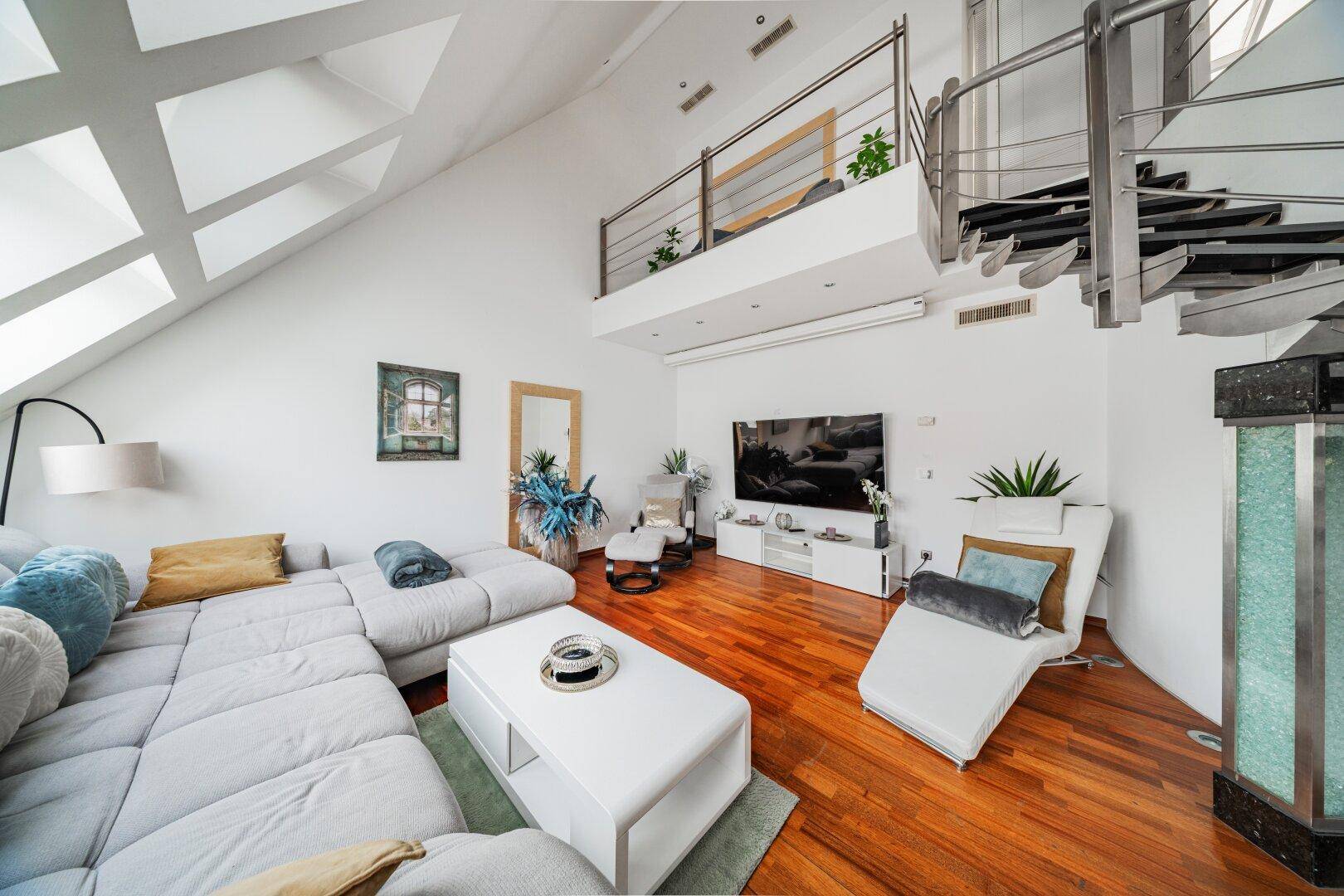 LUXURIÖSES WOHNEN ÜBER DEN DÄCHERN WIENS – MODERNE DG-WOHNUNG AUF 2 EBENEN MIT WHIRLPOOL + SAUNA + STELLPLATZ