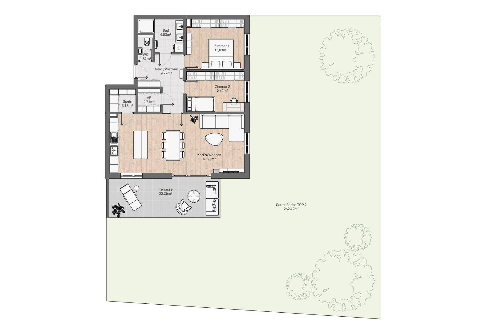 Letzte Gartenwohnung - Fertigstellung 2026! Kaiserallee Grafenstein - Baukörper K3 Top 2 (EG)