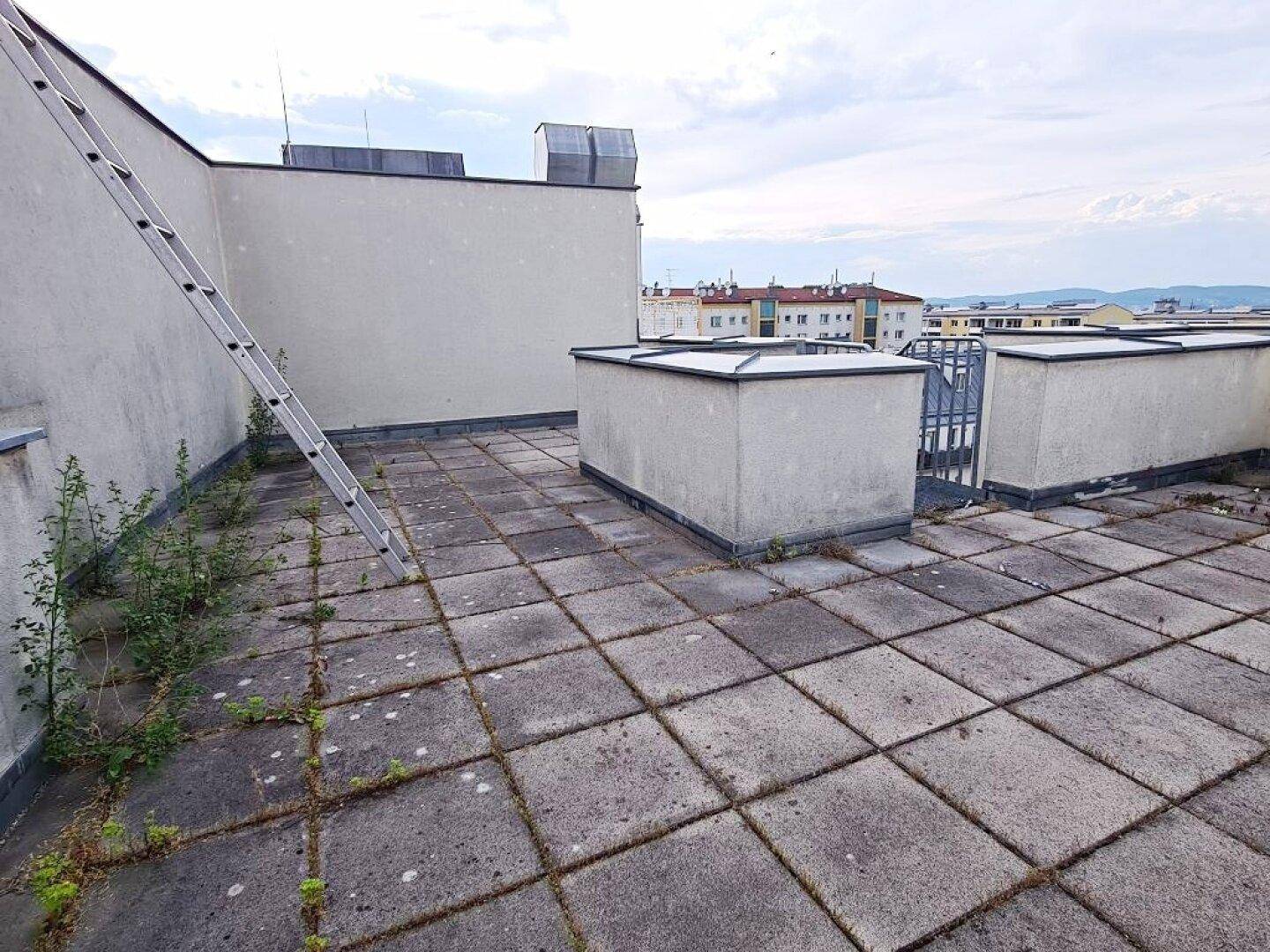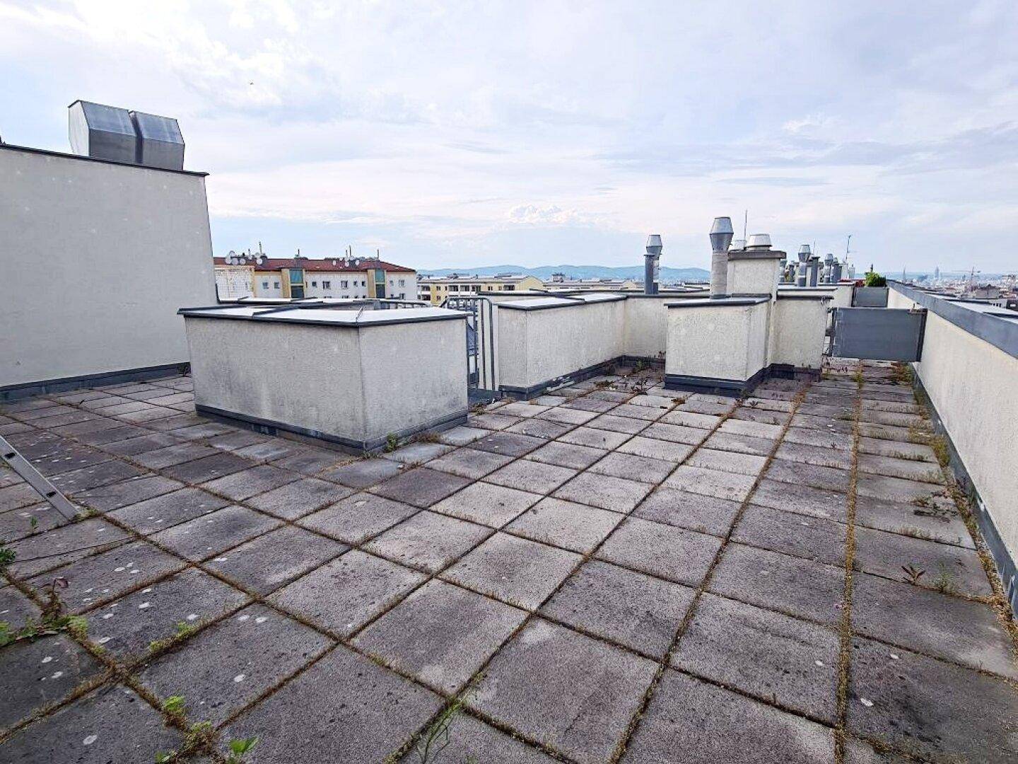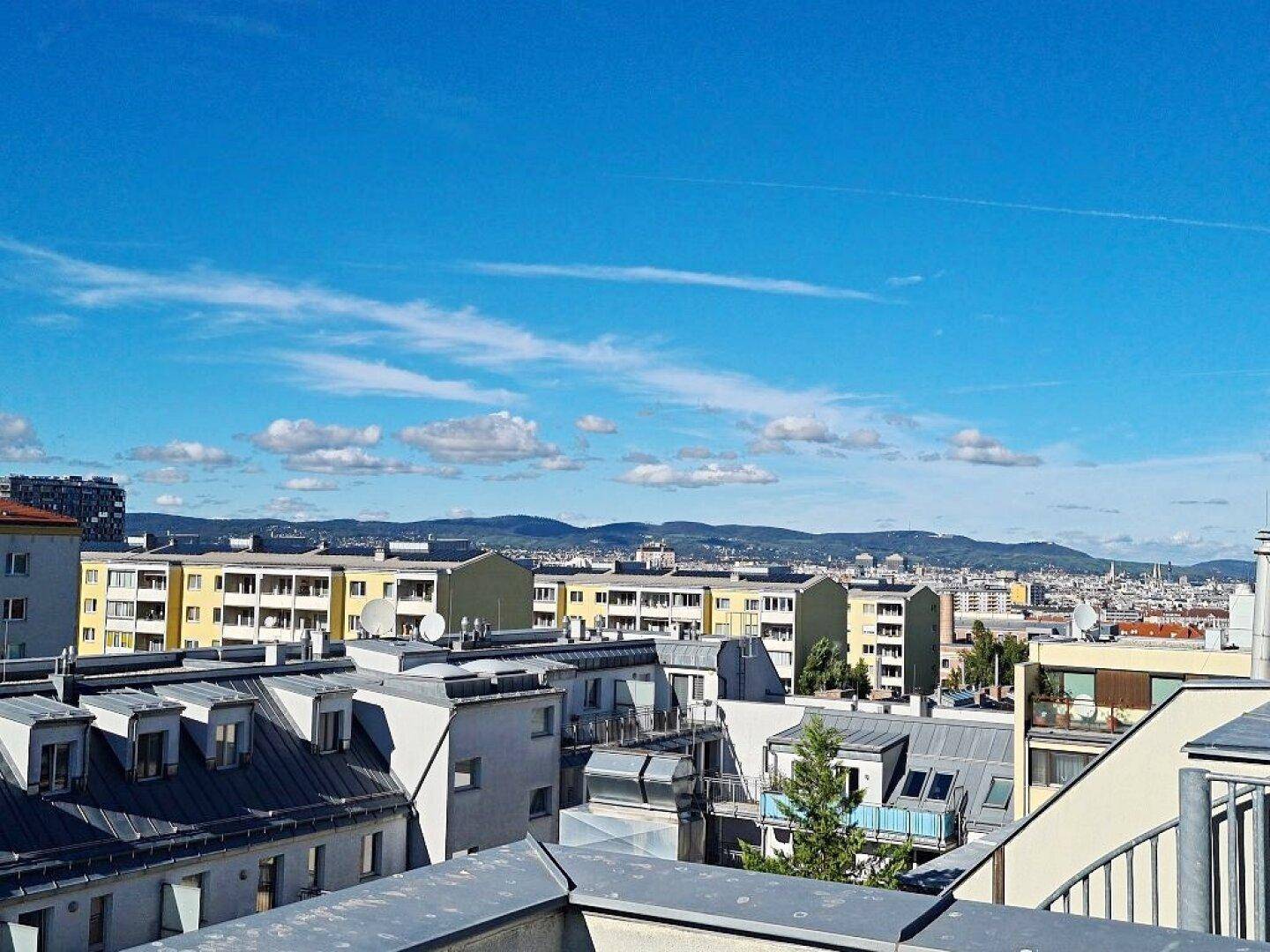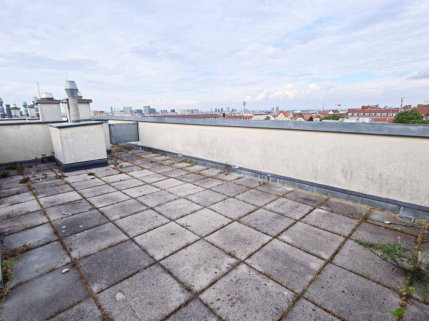 TERRASSENHIT, 61 m2 Dachgeschoß mit 48 m2 Terrasse, Wohnküche, 1 Zimmer, Wannenbad, Parketten, Fernblick, Holbeingasse