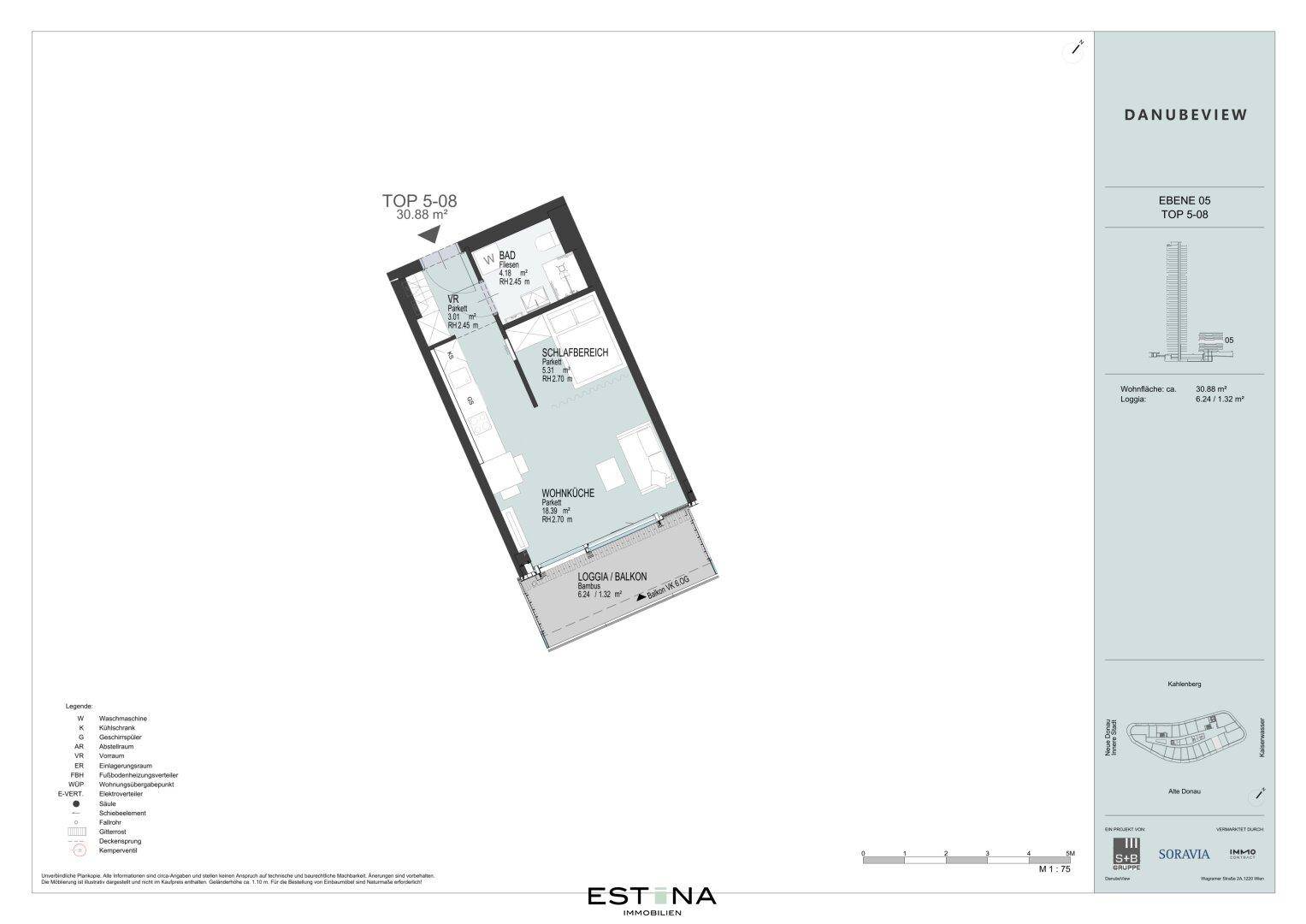 Singlewohnung mit Freifläche und Blick auf die Donauinsel